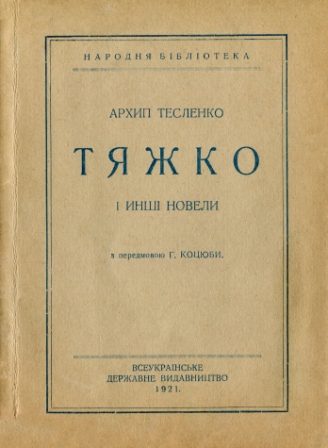 Тесленко А. Тяжко і інші новели / А. Тесленко ; з передм. Г. Коцюби. — Харків : Всеукр. держ. вид-во, 1921. — 87 с. : іл. — (Народня бібліотека).