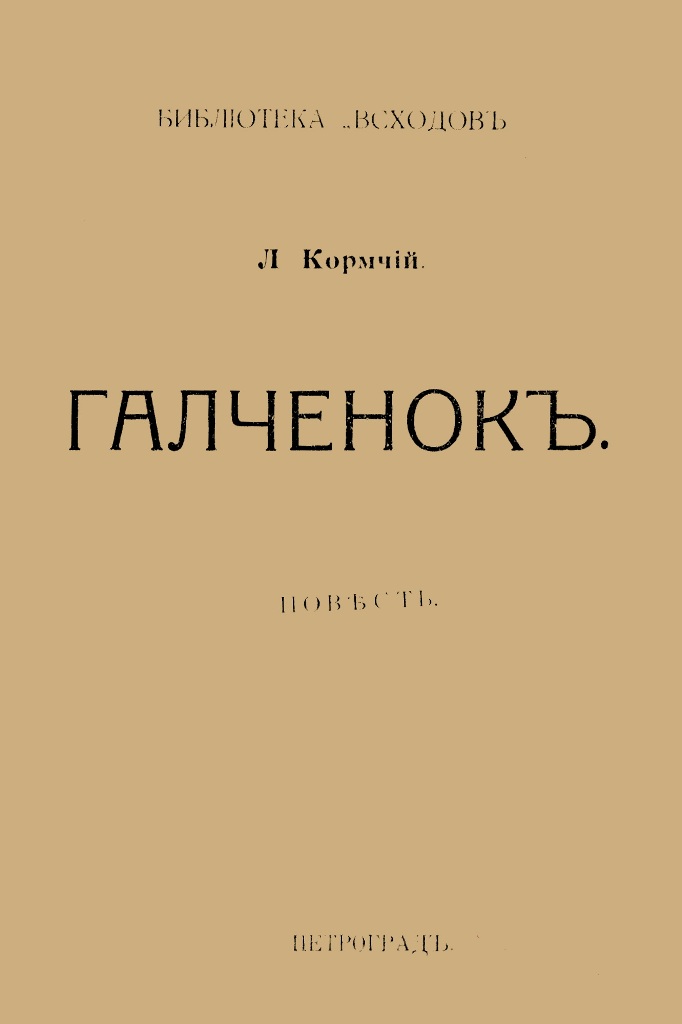 Кормчий Л. Галченок : повесть / Л. Кормчий (Пирагис Леонард Юлианович). - Петроград : [б. в.], 1916 (Петроград : Тип. Бр. В. и И. Линник). - 151 с. - (Библиотека Всходов ; №№ 11 и 12) (Бесплатное приложение к №№ 11 и 12 журнала "Всходы" за 1916 г.).