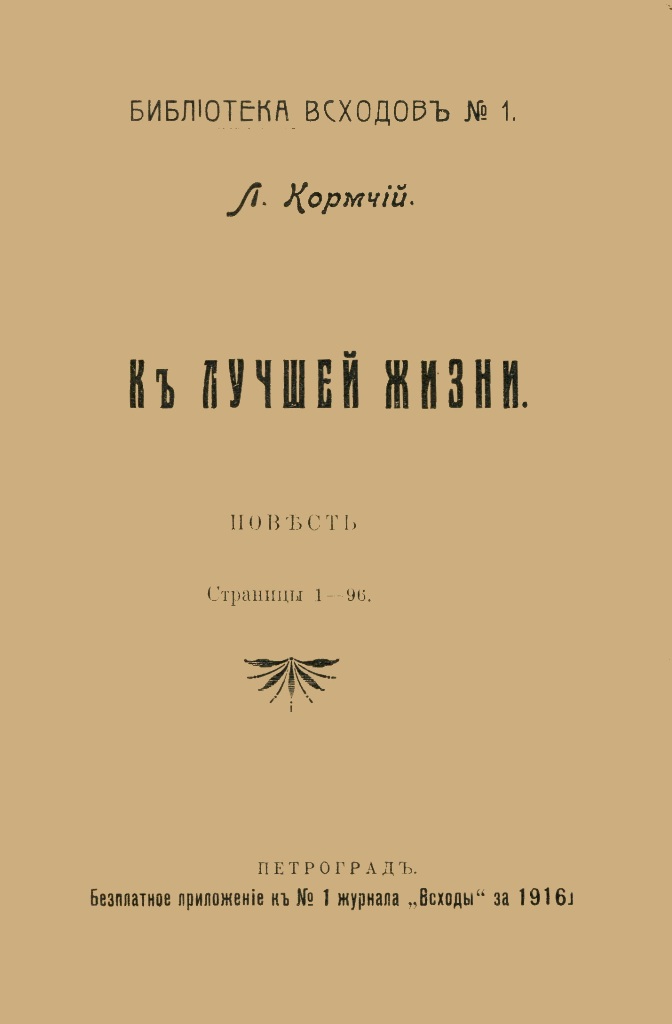 Кормчий Л. К лучшей жизни : повесть / Л. Кормчий (Пирагис Леонард Юлианович). - Петроград : [б. в.], 1916 (Петроград : Типография "Рассвет"). - С. 1-96. - (Библиотека Всходов ; № 1) (Бесплатное приложение к № 1 журнала "Всходы" за 1916 г.).