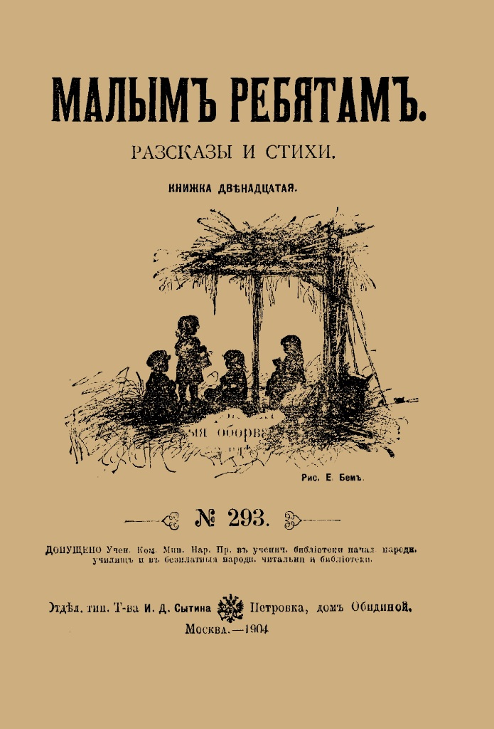 Малым ребятам : рассказы и стихи. Кн. 12 / собр. И. Горбунов-Посадов ; рис. Е. Бем. - М. : [б. в.], 1904 (М. : Отделение тип. Т-ва И. Д. Сытина). - 32 с. - На тит.: № 293. - Штамп: Дитяча бібліотека Д. Ю. Доброї.