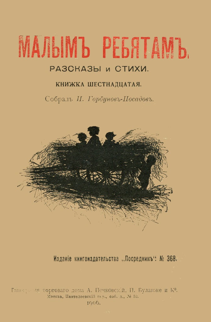 Малым ребятам : рассказы и стихи. Кн. 16 / собр. И. Горбунов-Посадов ; рис. Е. Бем. - М. : Посредник, 1906 (М. : Тип. торгового дома А. Печковский, П. Буланже и К). - 32 с. : ил. - На обл.: № 368. - Штамп: Дитяча бібліотека Д. Ю. Доброї.