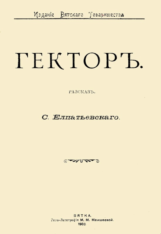 Елпатьевский С. Я. Гектор : рассказ / С. Елпатьевский. - Вятка : Издание Вятского Товарищества, 1903 (Вятка : Типо-Литография М. М. Маишеевой). - 36 с. - На тит. арк.: С. Елпатьевский. - Б. т. - Штамп: Дитяча бібліотека Д. Ю. Доброї.