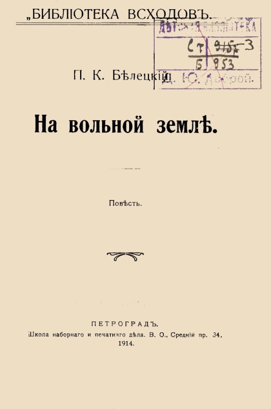 Белецкий П. К. На вольной земле : повесть / П. Белецкий. - Петроград : [б. в.], 1914 (Петроград : Школа наборного и печатного дела). - 112 с. - (Библиотека Всходов). - На тит. арк.: П. К. Белецкий. - Б. т. - Штамп: Дитяча бібліотека Д. Ю. Доброї.