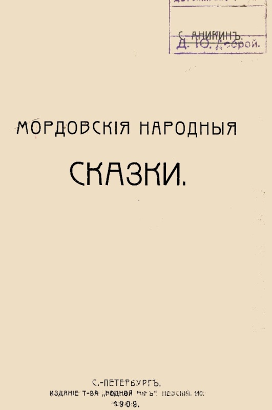 Аникин С. В. Мордовские народные сказки / С. Аникин. - СПб. : Товарищество "Водный мир", 1909 (СПб. : "Печатный Труд"). - 102 с. : ил. - На тит. арк.: С. Аникин. - Б. т. - Штамп: Дитяча бібліотека Д. Ю. Доброї.