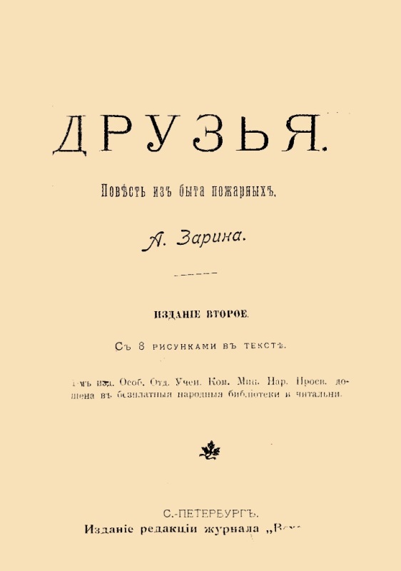 Зарин А. Е. Друзья : повесть из быта пожарных : с 8 рис. в тексте / А. Зарин. - Изд. 2-е. - СПб. : Издание редакции журнала "Всходы", [1903]. - 143 с. : ил. - На тит. арк.: А. Зарин. - Б. т. - Штамп: Дитяча бібліотека Д. Ю. Доброї.