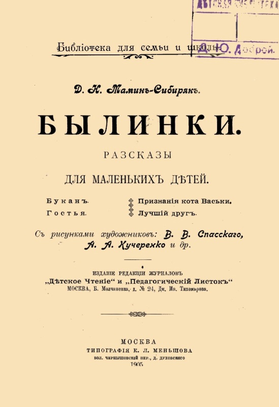 Мамин-Сибиряк Д. Н. Былинки : рассказы для мал. детей / Д. Мамин ; с рис. В. Спасского, А. Кучеренко и др. - М. : Издание редакции журнала "Детское Чтение" и "Педагогический Листок", 1905 (М. : Тип. К. Л. Меньшова). - 56 с. : ил. - (Библиотека для семьи и школы). - На тит. арк.: Д. Н. Мамин-Сибиряк. - Б. т. - Штамп: Дитяча бібліотека Д. Ю. Доброї.