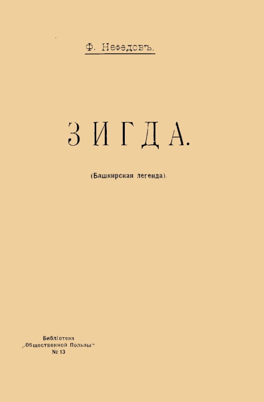 Нефедов Ф. Д. Зигда : (башк. легенда) / Ф. Нефедов. - М. : [б. в.], 1905 (М. : Тип. Товарищества "Общественная Польза"). - 20 с. - На тит. арк.: Ф. Нефедов. - Б. т. - Штамп: Дитяча бібліотека Д. Ю. Доброї.