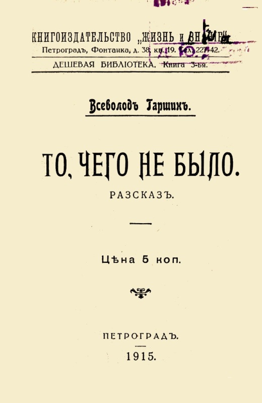 Гаршин В. М. То, чего не было : рассказ / В.Гаршин. - Петроград : Жизнь и знание, 1915 (Петроград : Тип. Л. Я. Ганзбурга). - 14 с. - (Дешевая библиотека ; Кн. 3). - На тит. арк.: Всеволод Гаршин. - Б. т. - Штамп: Дитяча бібліотека Д. Ю. Доброї.