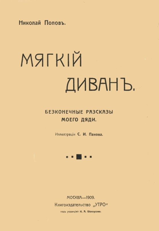 Попов Н. А. Маленькое собрание сочинений. Т. 1 : Мягкий диван : бесконеч. рассказы моего дяди / Н. Попов ; ил. С. И. Панова. - М. : Утро , 1909 (М. : Типо-литография Товарищества И. Н. Кушнерев и К). - 85 с. : ил. - На тит. арк.: Николай Попов. - Б. т. - Штамп: Дитяча бібліотека Д. Ю. Доброї.