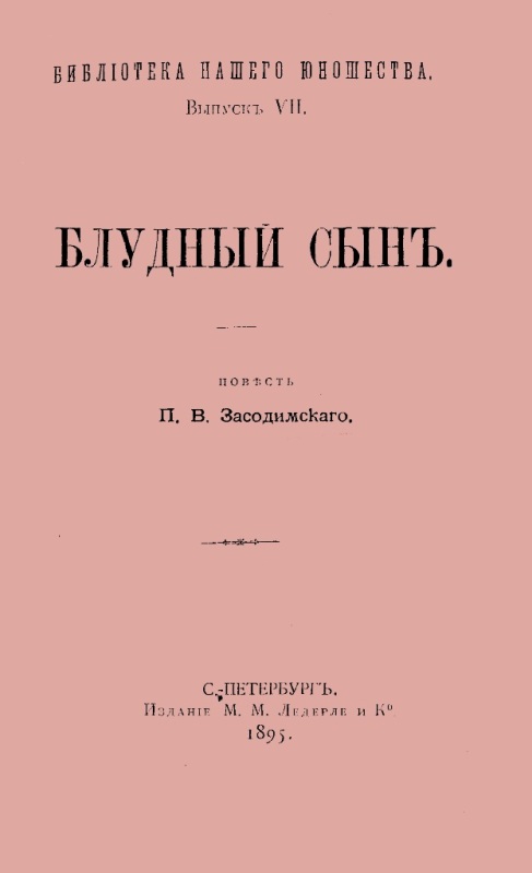 Засодимский П. В. Блудный сын : повесть / П. Засодимский. - СПб. : Издание М. М. Ледерле и К, 1895 (СПб. : Тип. П. П. Сойкина). - 134 с. : ил. - (Библиотека нашего юношества ; Вып. 7). - На тит.: П. Засодимский. - Б. т. - Штамп: Дитяча бібліотека Д. Ю. Доброї.