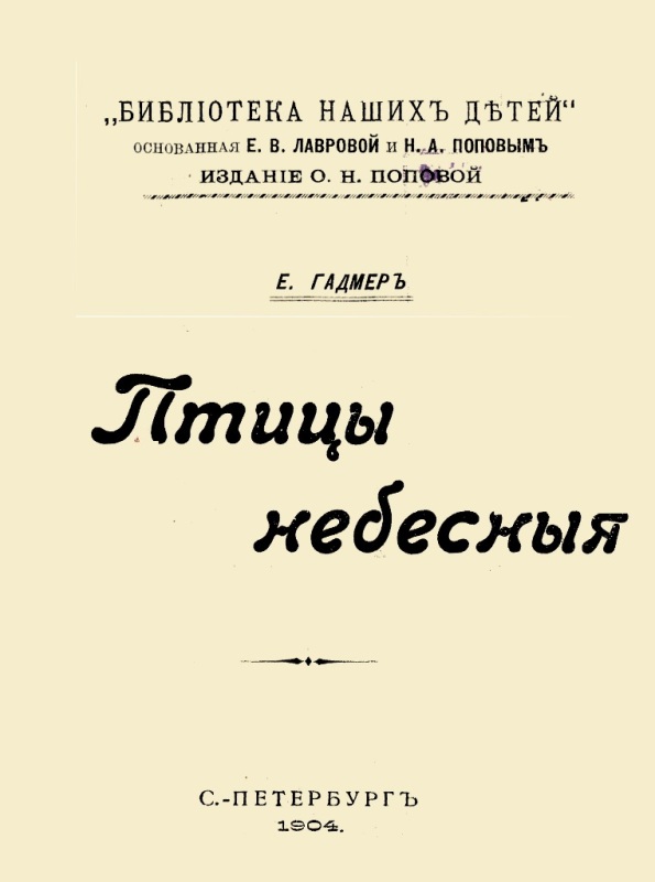 Гадмер Е. Птицы небесные / Е. С. Ушкова-Голова. - СПб. : Издание О. Н. Поповой, 1904 (СПб. : Тип. Исидора Гольдберга). - 104 с. : ил. - (Библиотека наших детей / Осн. Е. В. Лавровой и Н. А. Поповым). - На тит. арк.: Е. Гадмер. - Б. т. - Штамп: Дитяча бібліотека Д. Ю. Доброї.