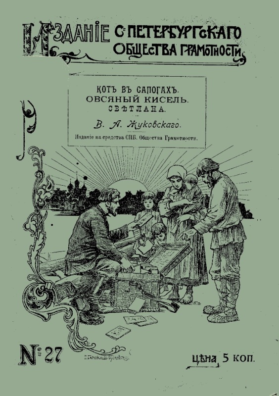 Жуковский В. А. Кот в сапогах ; Овсяный кисель ; Светлана / В. Жуковский. - СПб. : Издание Санкт-Петербургского Общества грамотности, 1904 (СПб. : Тип. Дома Призрения Малолет. Бедных). - 26 с. : ил. - На тит.: В. А. Жуковский. - Б. т. - Штамп: Дитяча бібліотека Д. Ю. Доброї. - На обкл.: № 27.