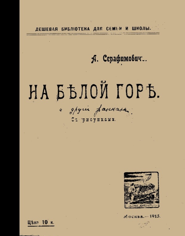 Серафимович А. С. На белой горе : с рис. / А. Серафимович. - М. : Издание редакции журнала "Юная Россия", 1915 (М. : Тип. К. Л. Меньшова). - 24 с. : ил. - (Дешевая библиотека для семьи и школы). - На тит.: А. Серафимович. - Конволют об'єднує 5 вид. - Б. т. - Штамп: Дитяча бібліотека Д. Ю. Доброї.