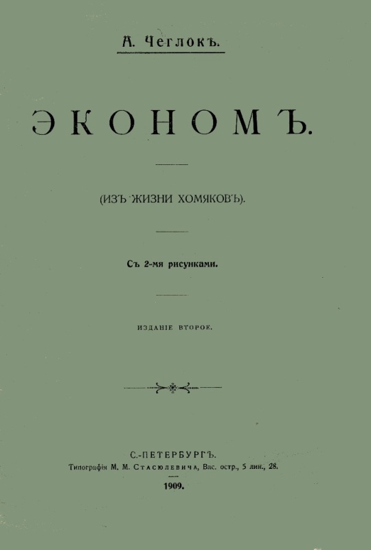 Чеглок А. Эконом : (из жизни хомяков) : с 2-мя рис. / А. Чеглок. - Изд. 2-е. - СПб. : [б. в.], 1909 (СПб. : Тип. М. М. Стасюлевича). - 14 с. : ил. - Б. т. - Штамп: Дитяча бібліотека Д. Ю. Доброї.