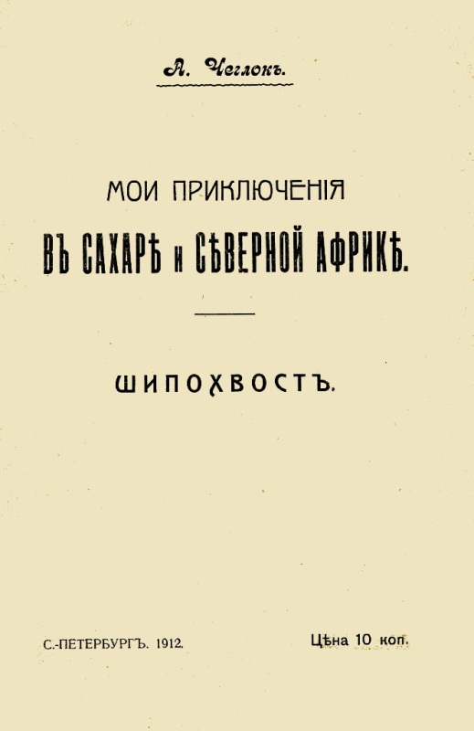 Чеглок А. Шипохвост / А. Чеглок. - СПб. : [б. в.], 1912 (Симферополь : Типография Таврического Губернского Земства). - 17 с. : ил. - (Мои приключения в Сахаре и Северной Африке). - Б. т. - Штамп: Дитяча бібліотека Д. Ю. Доброї.