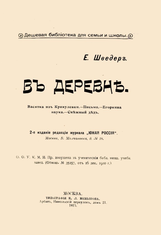 Шведер Е. И. В деревне / Е. Шведер ; [с рис. А. Нечаева и др.]. - 2-е изд. - М. : Издание журнала "Юная Россия", 1915 (М. : Тип. К. Л. Меньшова). - 40 с. : ил. - (Дешевая библиотека для семьи и школы). - На тит. арк.: Е. Шведер. - Б. т. - Штамп: Дитяча бібліотека Д. Ю. Доброї.