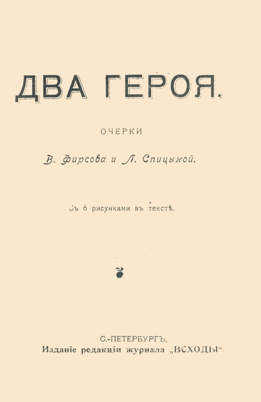 Фирсов В. Два героя : очерки : с 6 рис. в тексте / В. Фирсов, Л. Спицына. - СПб. : Издание редакции журнала "Всходы", [1905] (Тип. СПб. Товарищества "Труд" : СПб.). - 131 с. : ил. - Б. т. - Штамп: Дитяча бібліотека Д. Ю. Доброї.