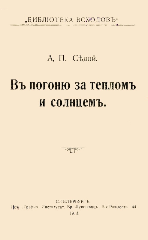 Седой А. П. В погоню за теплом и солнцем / А. Седой. - СПб. : [б. в.], 1913 (СПб. : Печать Графического Институтта Бр. Лукшевиц). - 80 с. - (Библиотека Всходов). - Б. т. - Штамп: Дитяча бібліотека Д. Ю. Доброї.