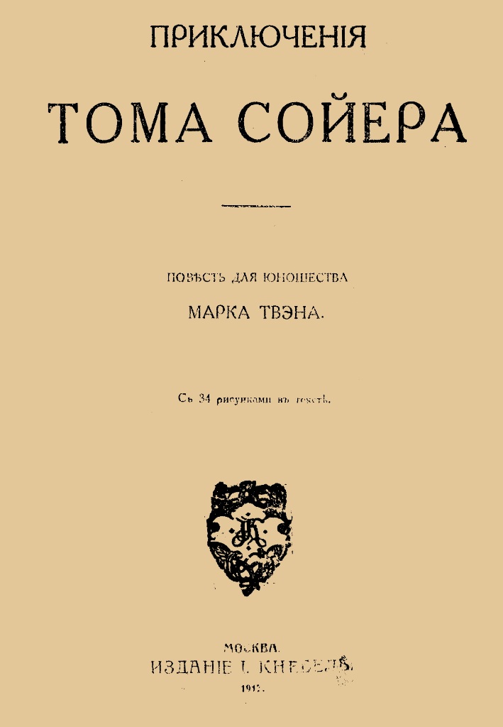 Твен М. Приключения Тома Сойера : повесть для юношества : с 34 рис. в тексте / М. Твен (Сэмюел Клеменс). - М. : Издание И. Кнебель, 1917 (М. : Тип. "Московское Печатное Производство" В. Г. Венгерова). - 296 с. : ил.