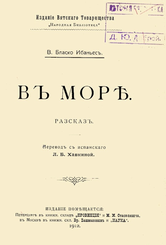 Бласко Ибаньес В. В море : рассказ / В. Бласко Ибаньес ; пер. с исп. Л. Хавкиной. - [СПб.] : Издание Вятского Товарищества "Народная Библиотека ", 1912 (СПб. : Тип. М. Стасюлевича). - 15 с. - На тит. арк.: В. Бласко Ибаньес. - Б. т. - Штамп: Дитяча бібліотека Д. Ю. Доброї.