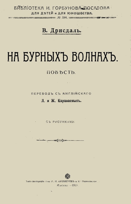 Дрисдаль В. На бурных волнах : повесть : с рис. / У. Драйздейл ; пер. с англ. Л. и Ж. Караваевых. - М. : [б. в.], 1915 (М. : Типо-литография Товарищества И. Н. Кушнерев и К). - 149 с. : ил. - (Библиотека И. Горбунова-Посадова для детей и для юношества ; № 310). - На обкл. авт. не зазнач. - Б. т. - Штамп: Дитяча бібліотека Д. Ю. Доброї.