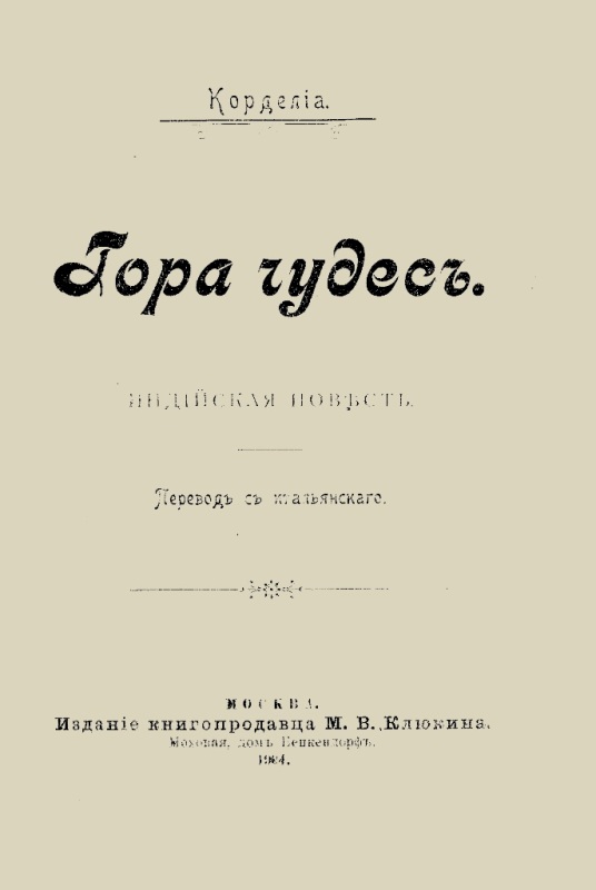 Корделиа. Гора чудес : инд. повесть : пер. с итал. / В. Тревес. - М. : Издание М. В. Клюкина, 1904 (М. : Типо-литография Г. И. Простакова). - 32 с. : ил. - Б. т. - Штамп: Дитяча бібліотека Д. Ю. Доброї.