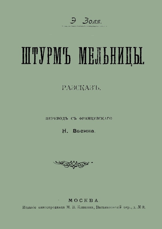Золя Э. Штурм мельницы : рассказ / Э. Золя ; пер. с фр. Н. Васина. - М. : Издание М. В. Клюкина, [1909] (М. : Тип. Вильде). - 48 с. - На тит. арк.: Э. Золя. - Б. т. - Штамп: Дитяча бібліотека Д. Ю. Доброї.