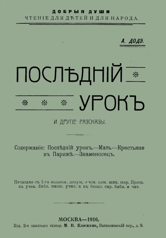 Додэ А. Последний урок и другие рассказы / А. Додэ. - Изд. 3-е. - М. : Издание книжного склада М. В. Клюкина, 1916 (М. : Тип. Вильде). - 32 с. : ил. - (Добрые души. Чтение для детей и для народа). - На тит.: А. Доде. - Б. т. - Штамп: Дитяча бібліотека Д. Ю. Доброї. - На обкл.: Изд. 2-е.