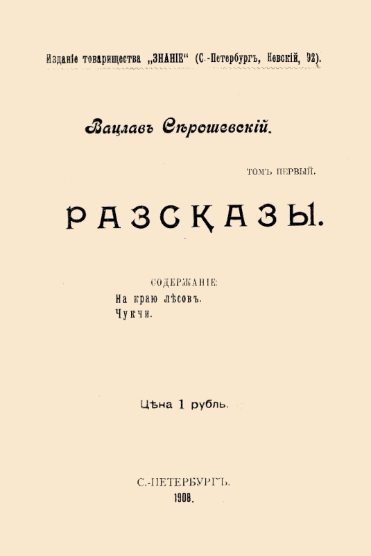 Серошевский В. Л. Рассказы. Т. 1 / В. Серошевский. - СПб. : Издание товарищества "Знание", 1908 (СПб. : Тип. акционерного общества "Слово"). - 296 с. : ил. - На тит. арк.: В. Серошевский. - Б. т. - Штамп: Дитяча бібліотека Д. Ю. Доброї.