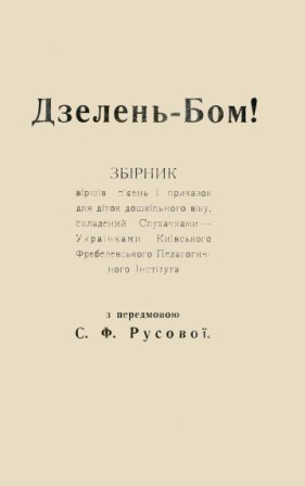 Дзелень-Бом! : зб. віршів, пісень і приказок для діток дошк. віку, складений Слухачками – Українками Київського Фребелевського Педагогічного Інституту / з передм. С. Ф. Русової. – Київ : [б. в.], 1916 (Київ : Друкарня Київської 2-ї Артілі). – 126 с. : іл.