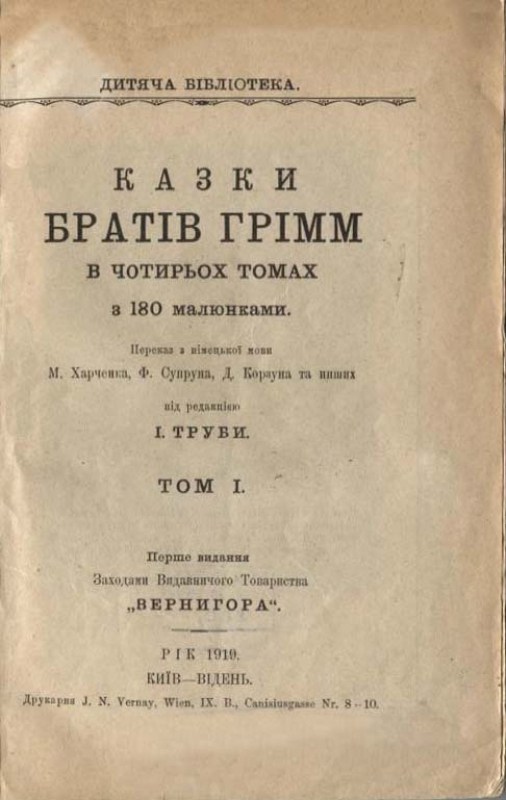 Гримм В. Казки Братів Грімм : в 4-х т. з 180 мал. Т. 1 / В. Грімм, Я. Грімм ; переказ з нім. М. Харченка, Ф. Супруна, Д. Корзуна та ін.; під ред. І. М. Труби. — 1-е вид. — К. ; Відень : Вернигора, 1919 (Wien : Друк. I.N.Vernay). — 160 с. : іл., портр. — (Дитяча бібліотека).