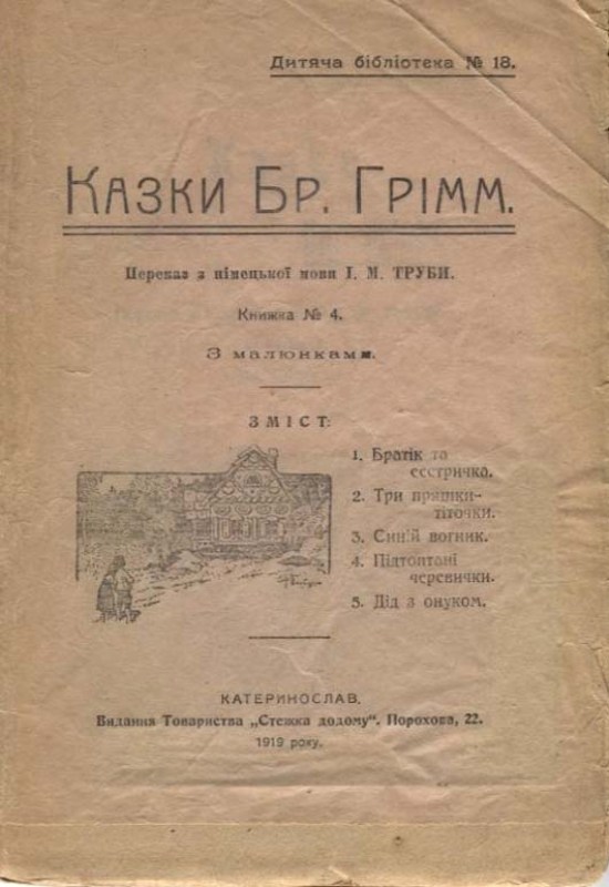 Гримм В. Казки. Кн. 4 / В. Гримм, Я. Гримм ; переказ з нім. І. М. Труби. — Катеринослав : Вид. Т-ва «Стежка додому», 1918 (Катеринослав : Друк. Губ. земства). — 32 с. : іл. — (Дитяча бібліотека ; N 18).