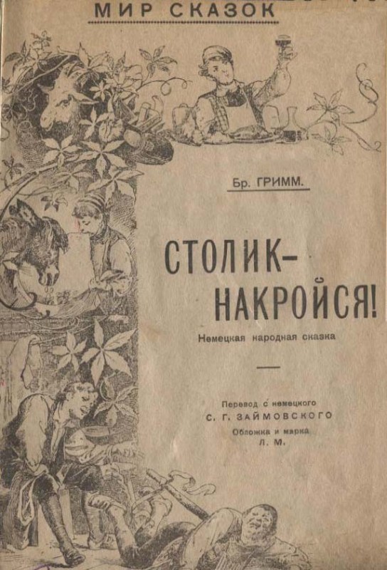 Гримм В. Столик, накройся! : нем. нар. сказка / В. Гримм, Я. Гримм ; пер. с нем. С. Займовского ; обл. и марка Л. М. — М. : Книгоизд-во Г. Ф. Мириманова, [1923] (М. : Тип. Отд. Упр. М.С.Р., К. и К.Д.). — 16 с. : ил. — (Мир сказок). — Повнотекстова версія в мережі інтернет: http://arch.rgdb.ru/xmlui/handle/123456789/27941#page/0/mode/2up