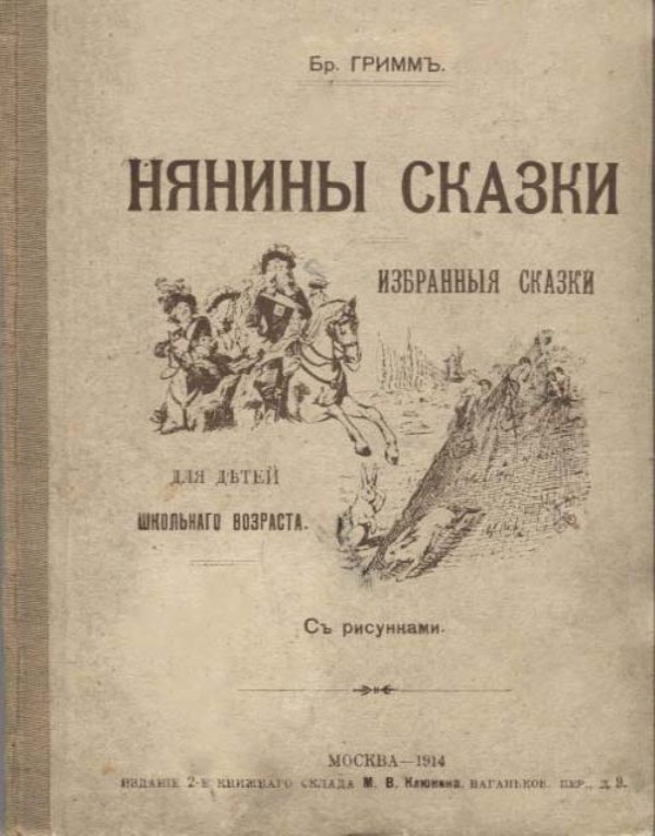 Гримм В. Нянины сказки : избр. сказки для детей шк. возраста : с рис. / В. Гримм, Я. Гримм. — Изд. 2-е, печ. с 1-го изд. — М. : Изд. кн. склада М. В. Клюкина, 1914 (М. : Типография В. И. Воронова). — 112 с. : ил.