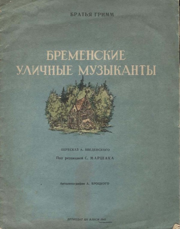 Гримм В. Бременские уличные музыканты / В. Гримм, Я. Гримм ; пересказ А. Введенского ; под ред. С. Маршака; автолитогр. А. Яроцкого. — М. : Детиздат ЦК ВЛКСМ, 1941. — 12 с. : ил.
