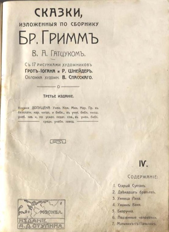 Гримм В. Сказки, изложенные по сборнику Братьев Гримм В. А. Гатцуком. — Вып. 3 / В. Гримм, Я. Гримм ; с 18 рис. худож. Грот-Иогана и Р. Шнейдер ; обл. В. Спасского. — 3-е изд. — М. : Изд. А. Д. Ступина, 1909 (М. : Типография Т-ва И. Н. Кушнерев и К). — С. 97-144 : ил. — Конволют об'єднує 2 вид.