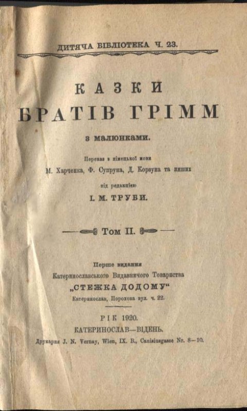 Гримм В. Казки Братів Грімм. Т. 2 / В. Грімм, Я. Грімм ; переказ з нім. М. Харченка, Ф. Супруна, Д. Корзуна та ін. ; під ред. І. М. Труби. — 1-е вид. — Катеринослав ; Відень : Стежка додому, 1920 (Wien : Друк. J.N.Vernay). — 160 с. : іл. — (Дитяча бібліотека ; Ч. 23).