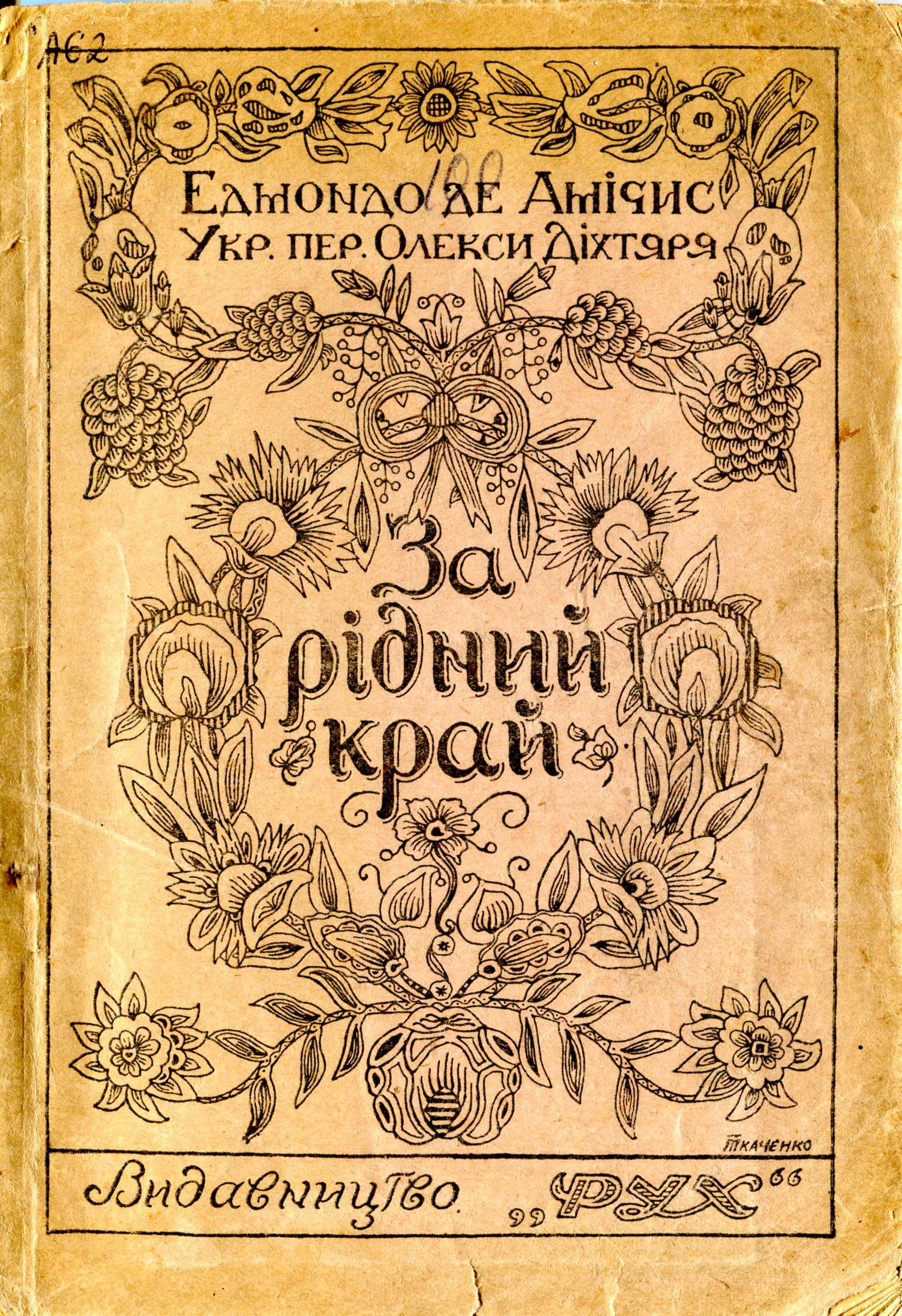 Амічіс Е. де. За рідний край : (збірник оповідань для юнацтва) / Е. де Амічіс ; укр. пер. Олекси Діхтяря ; [обкл. Ткаченко]. – Харків : Кооперативне Видавництво «Рух», 1919. – 80 с. – (Дитяча та юнацька книгозбірня ; Ч. 19). – На тит.: Е. Д.’Амічіс. – На обкл.: Едмондо де Амічіс.
