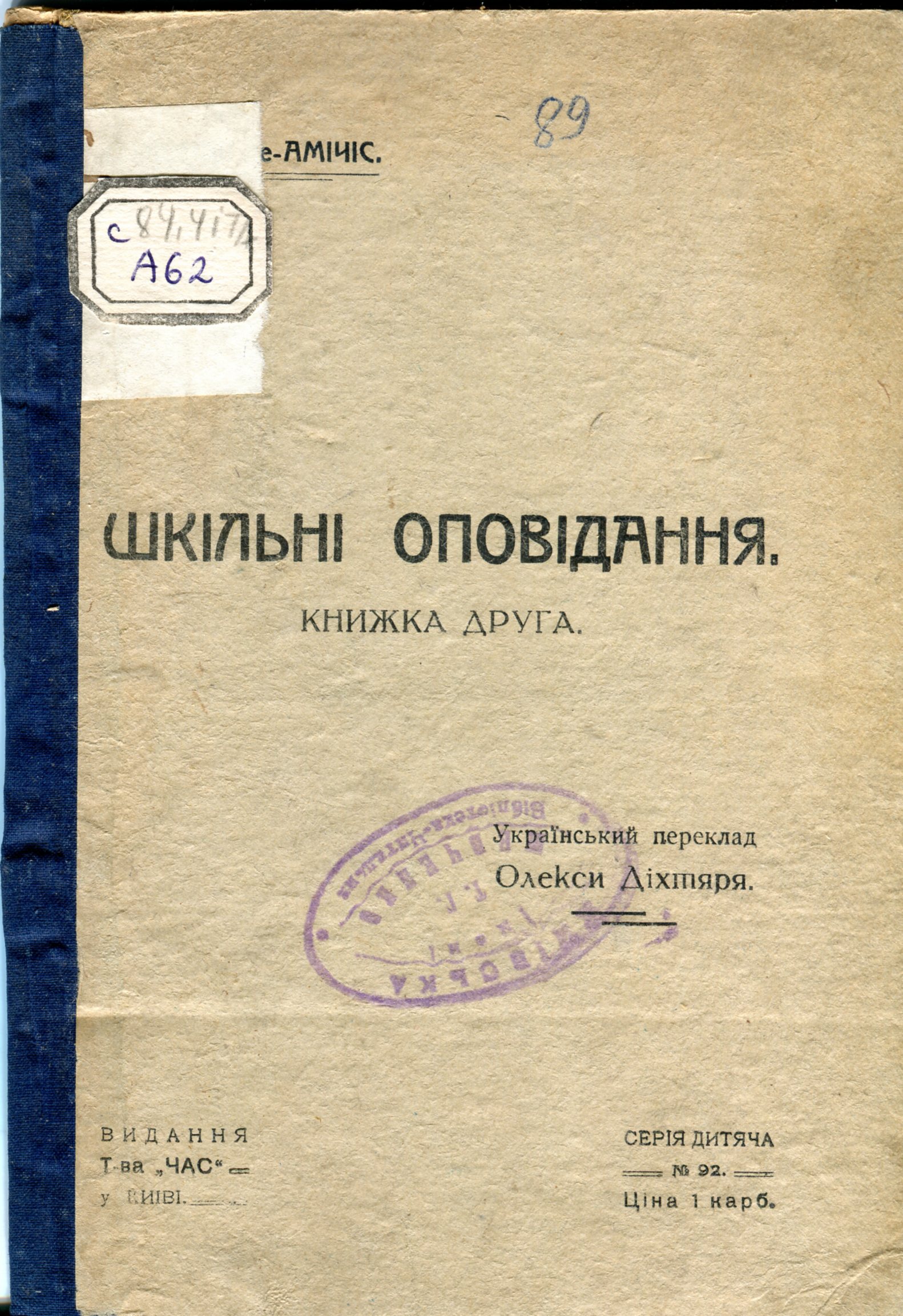 Амічіс Е. де. Шкільні оповідання Кн. 2 / Е. де Амічіс ; український переклад Олекси Діхтяря. – Київ : Видання Т-ва «Час», 1918 (Друкарня Київської Губерніяльної Народної Управи). – 32 с. : іл. – (Серія дитяча ; № 92). – На тит.: Едмондо де Амічіс.