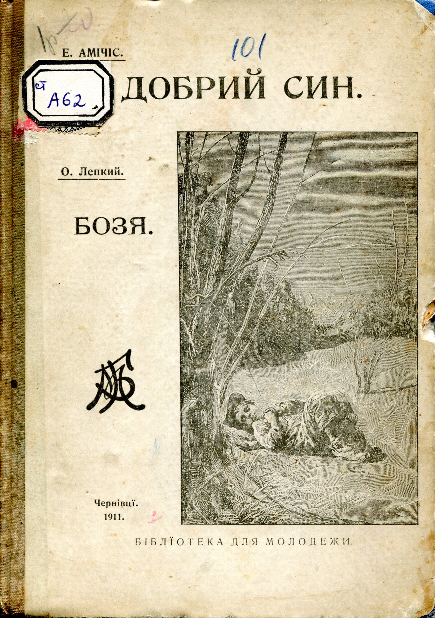 Амічіс Е. де. Добрий син / Е. де Амічіс ; з італійської мови переклала Н. Кибальчич. Лепкий Д. Бозя : оповіданє / Д. Лепкий. – Чернівці. : накладом «Бібліотеки для молодежи», 1911 (Друкарня «Руської Ради»). – 66 с. : іл.