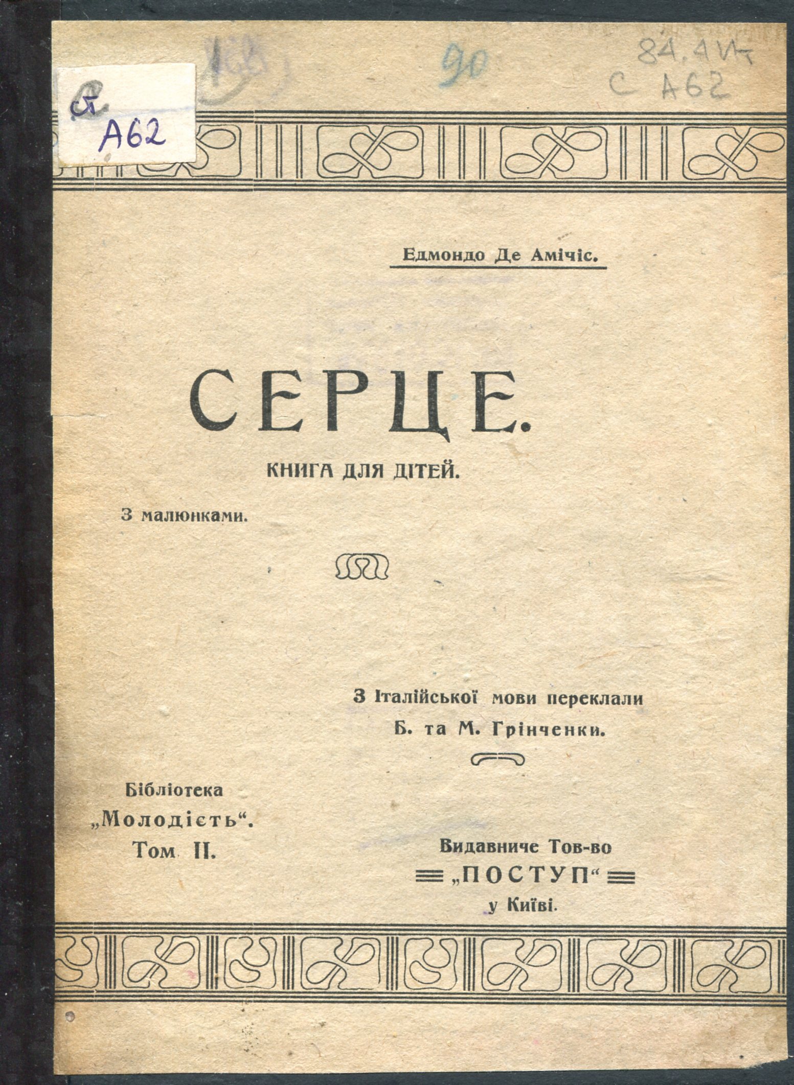 Амічіс Е. де. Серце / книга для дітей / написав Е. де Амічіс; з італійської мови переклали Б. Грінченко та М. Грінченко ; [передм. С. Волоха]. – Київ : Видавниче тов-во «Поступ», 1919 (Друкарня «Посл. Нов.»). – 285 с. : іл., портр. – (Бібліотека «Молодість» ; Т. II). – На звороті тит. арк. присвята : Памяті внука нашого Волі Грінченка присвячуємо цей переклад. Б. та М. Грінченки. – Видав. бібліогр.: Кн. Укр. хлібороб. вид-ва «Український Агроном» : с. 286-287.
